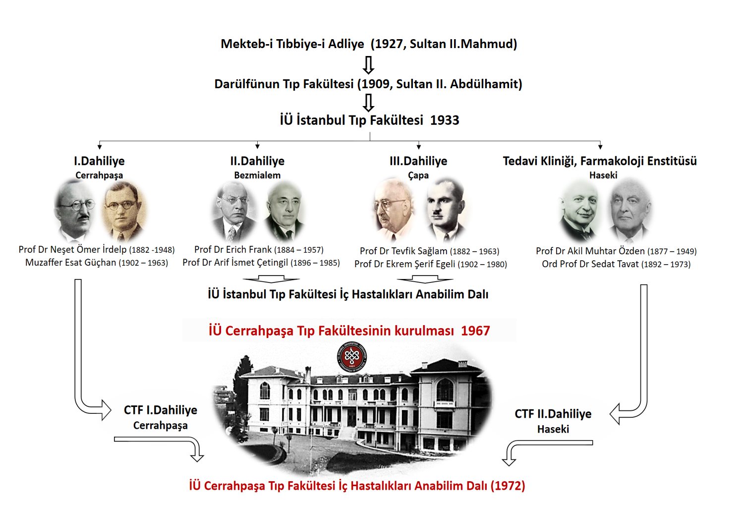 Üniversite Reformu öncesi Cerrahpaşa Hastanesi İstanbul Belediyesine ait bir hastaneydi. 1911 yılında Takiyüddin Paşa Konağı satın alınarak kurulmuştu. Hastaların ilaçları, yemekleri belediye tarafından karşılanırdı. Fakat klinikler ayrı ve bağımsız çalışırlardı. İlk açılan bölümler dahiliye, kulak burun boğaz servisleri ile verem, frengi hastalarının yattığı intaniye servisleridir. Ameliyathane ve cerrahi servislerin yer aldığı bina ise 1913 yılında tamamlanmıştır.1933 Üniversite Reformu sonrasında, İstanbul 1. İç Hastalıkları Kliniği Cerrahpaşa Hastanesi’nde kurulmuş ve Atatürk’ün de özel hekimliğini yapan Ord. Prof. Dr. Neşet Ömer İrdelp İç Hastalıkları Kliniği Direktörü olmuştur. Neşet Ömer İrdelp adına Cerrahpaşa içinde yapılan amfi 2020 yılında İstanbul Üniversitesi-Cerrahpaşa Rektörlüğü tarafından restore edilerek yeniden kullanıma açılmıştır. Amfinin koridorlarında Neşet Ömer İrdelp’in hayatından kesitleri gösteren fotoğraflar sergilenmektedir. İrdelp’in yazıp imzaladığı Atatürk’ün ölüm belgesinin de bir kopyası bu sergide görülebilir. Üniversite Reformu sonrasında Haydarpaşa’daki Tıp Fakültesi Avrupa yakasına taşınınca Haseki, Cerrahpaşa, Şişli Etfal Hastaneleri hem belediye hem de İstanbul Üniversitesi Rektörlüğüne bağlı duruma gelmişlerdir. 1967 yılına kadar hem Cerrahpaşa ve Haseki Hastanelerindeki Üniversite Klinikleri ve hem de Belediye Klinikleri iç hastalıkları hizmet ve eğitimine devam etmiştir. Cerrahpaşa Tıp Fakültesi İç Hastalıkları Anabilim Dalı’nın geçmişi İstanbul Üniversitesi Dahiliye Kliniklerine dayanmaktadır. İstanbul Üniversitesi Tıp Fakültesi bünyesinde 4 adet Dahiliye Kliniği mevcuttu :